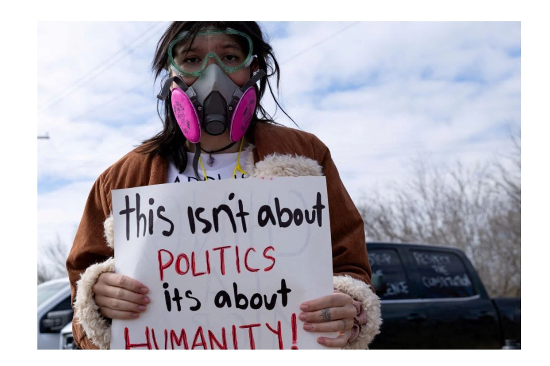 Elizabeth Anne Jolly holds a sign as she protests hours after 5-year-old Liam Conejo Ramos and his father, Adrian Conejo Arias, returned home after a judge ordered them to be released from Immigration and Customs Enforcement detention at the South Texas Family Residential Center in Dilley, Texas, Feb. 1. (OSV News/Reuters/Kaylee Greenlee)